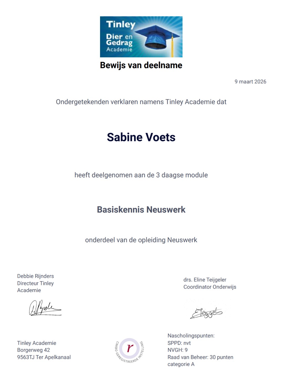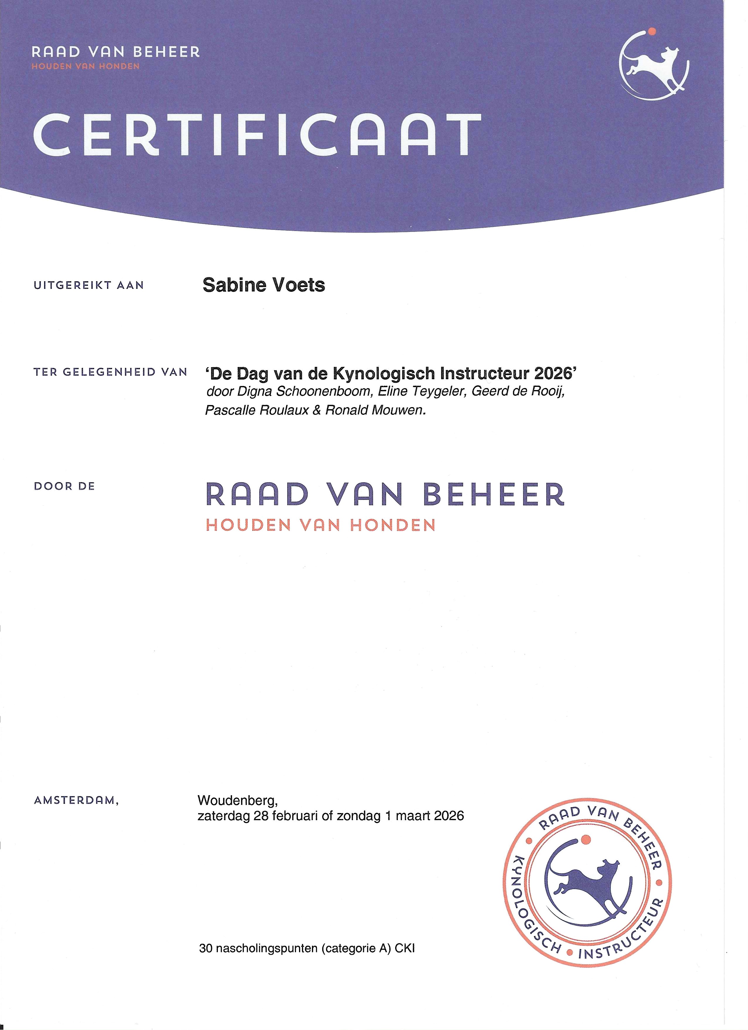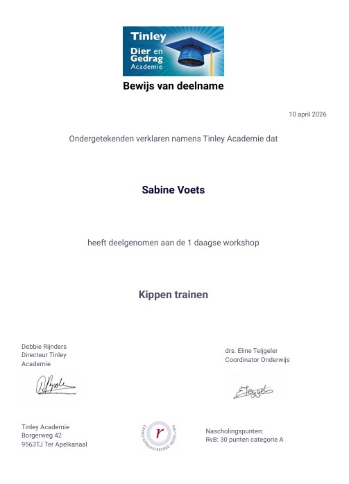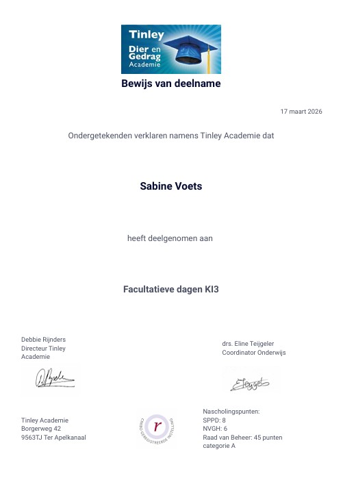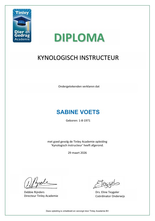Op dit moment ben ik bezig met de opleiding tot neuswerk instructeur. Deze opleiding geeft me de mogelijkheid om neuswerk toe te voegen aan de lessen maar ook om specifiek les te geven in detectie. Meer informatie daarover kunt u lezen onder het kopje lesaanbod. En ook daarna zal ik me blijven verdiepen en is de planning begin 2027 te starten met de opleiding tot gedragstherapeut bij honden.